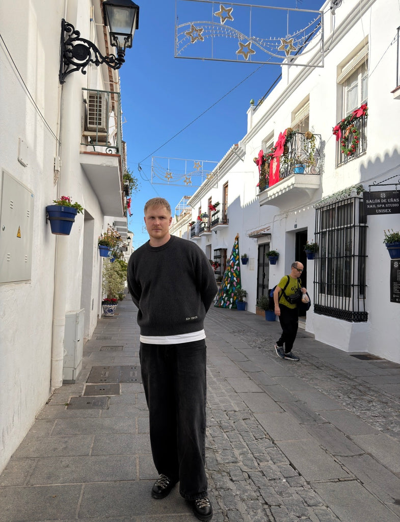 Our SDY rib knit crewneck, a push into a new product developments and direction . Manufactured from 100% cotton rib knit, the silhouette is a boxy cropped fit. hand stitched embroidery.